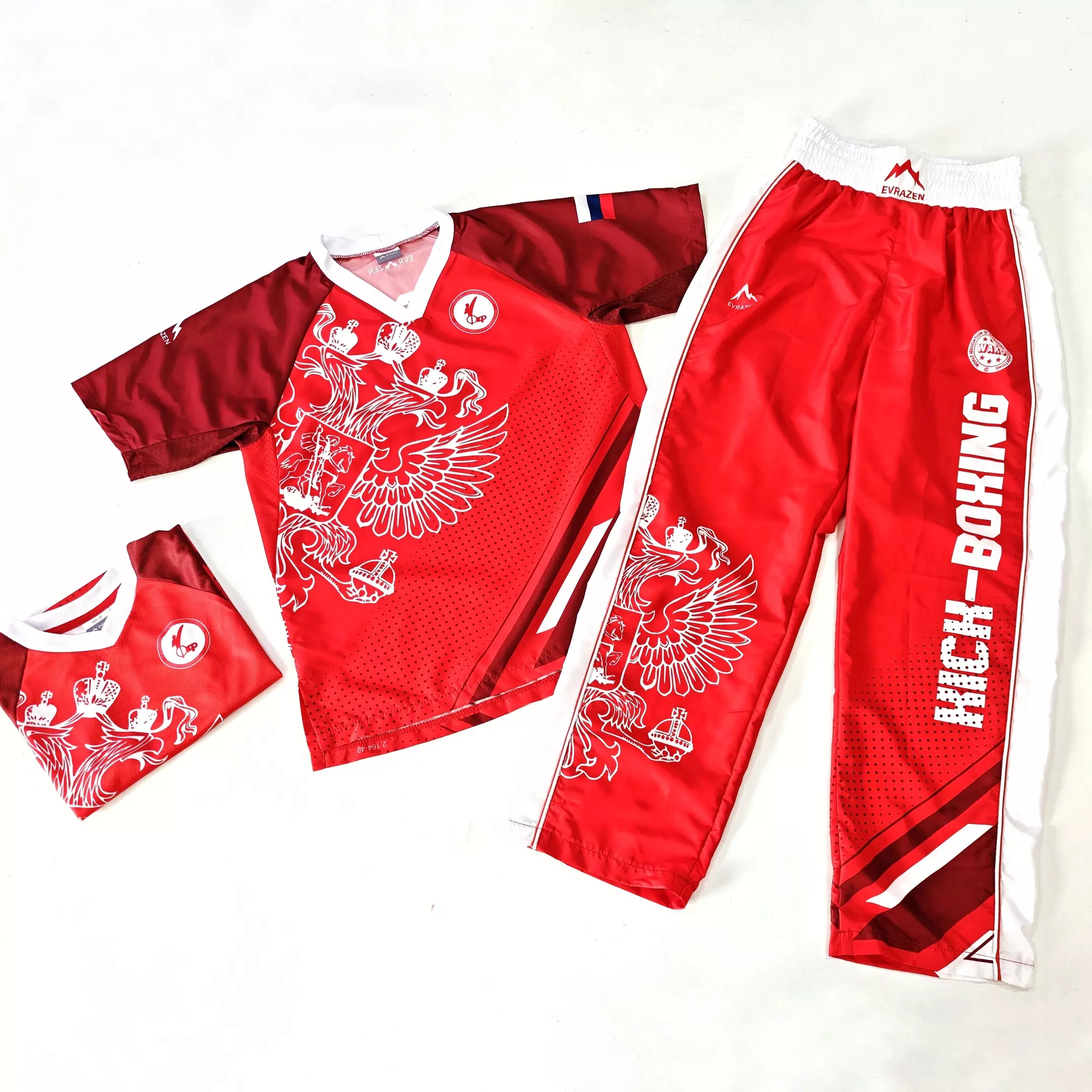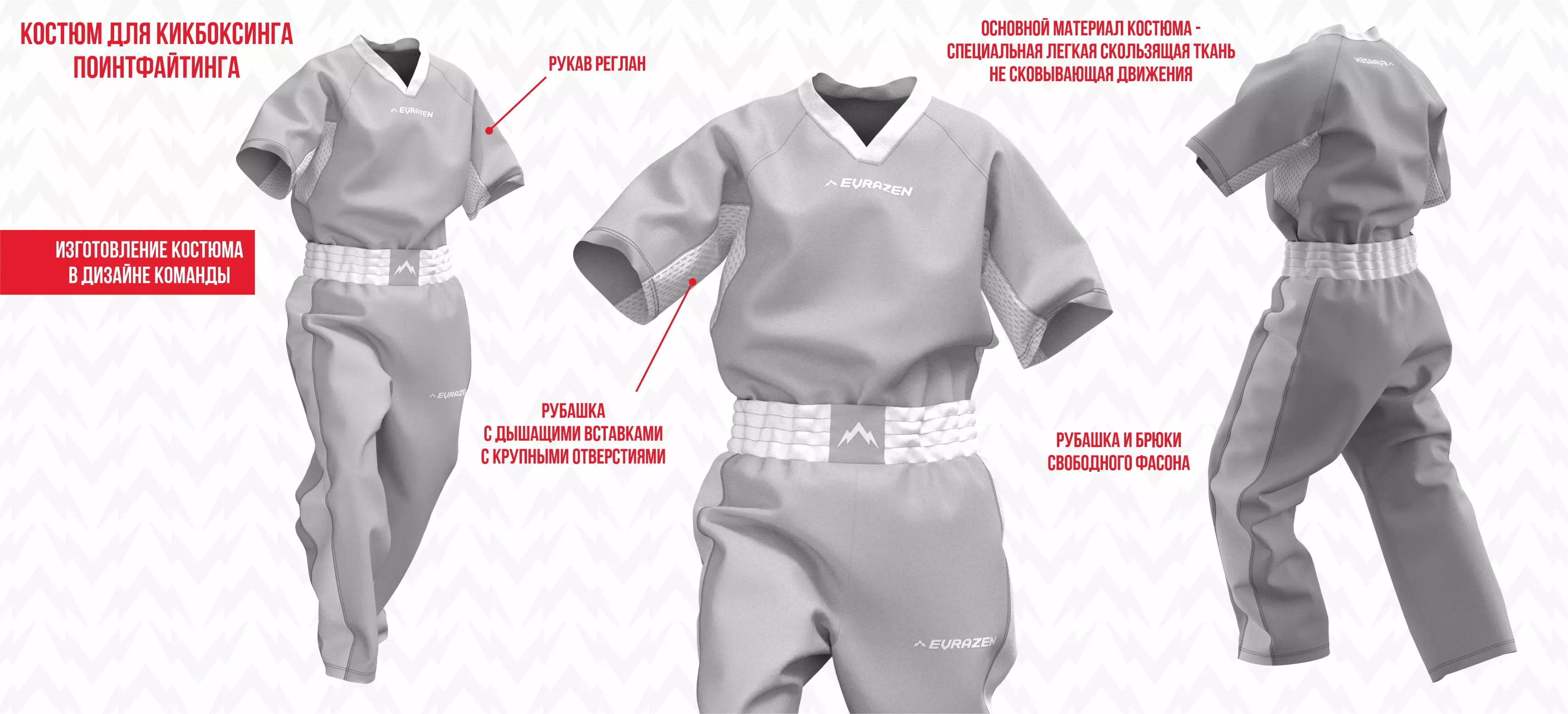 Костюм для кикбоксинга "Поинт" изготовлен из легкой скользящей по телу ткани. Фасон костюма свободный, не сковывающий движения. На внутренней части рукавов и по бокам рубашки имеются дышащие вставки с крупными отверстиями для лучшей вентиляции тела спортсмена.